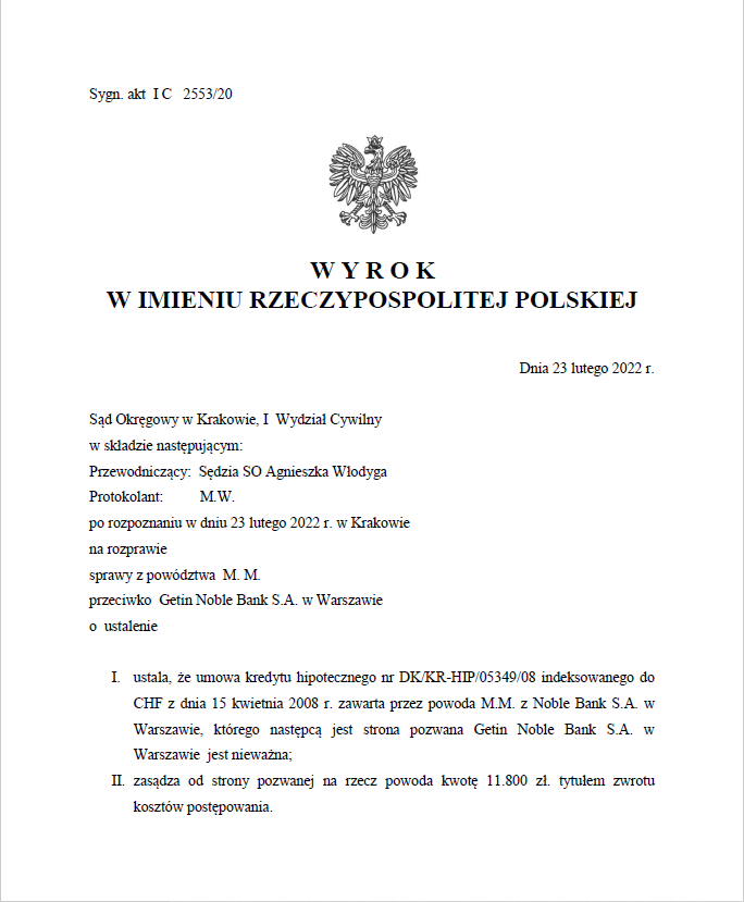 Wyrokiem z dnia 23 lutego 2022 r., Sąd Okręgowy w Krakowie I Wydział Cywilny ustalił, że umowa, którą zawarł z Getin Noble Bank S.A. (wówczas Noble Bank S.A.) klient Kancelarii jest w całości nieważna i nie wiąże go. Umowa kredytu frankowego z Getin Noble Bank miała go obowiązywać jeszcze przez kilkanaście lat. W ramach umowy musiałby zapłacić jeszcze kilkaset tysięcy złotych. Na skutek złożonego pozwu jego sytuacja stała się diametralnie lepsza.