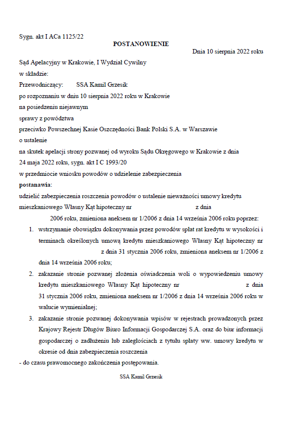 Mając na względzie ogólne przesłanki udzielenia zabezpieczenia poprzez wstrzymanie spłaty rat kredytu frankowego, Kancelaria złożyła imieniem klienta wniosek o zabezpieczenie roszczenia o ustalenie nieważności umowy zawartej z PKO BP S.A. We wniosku domagaliśmy się wstrzymania spłaty rat w wysokości i terminie określonym w umowie, zakazania Bankowi wypowiedzenia przedmiotowej umowy oraz dokonywania wpisów powodów do Krajowego Rejestru Długów. W uzasadnieniu wniosku wskazaliśmy na specjalny status kredytobiorców w postępowaniach frankowych oraz istnienie po jego stronie interesu prawnego. Wniosek został uwzględniony w całości, a Sąd Apelacyjny w Krakowie orzekł, że na czas trwania postępowania konieczne jest wstrzymanie spłaty rat kredytu frankowego. Postanowienie jest wykonalne, a zatem od jego wydania Klienci nie muszą spłacać rat kredytu. Na dzień publikacji niniejszego wpisu, Sąd nie sporządził jeszcze uzasadnienia Postanowienia. Gdy tylko zostanie ono sporządzone, postaram się nim podzielić w oddzielnym wpisie.