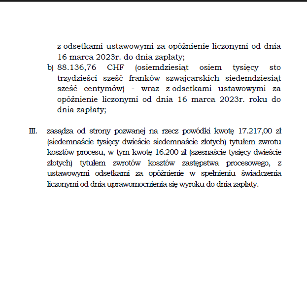 Wyrokiem z dnia 31 maja 2024 r. Sąd Okręgowy w Krakowie I Wydział Cywilny ustalił nieważność aneksu do Umowy Własny Kąt hipoteczny jaki został zawarty z PKO BP S.A. Na mocy aneksu, Kredytobiorca przewalutował dotychczasowy kredyt wyrażony w PLN oraz „dobrał” kilkaset tysięcy złotych kredytu. Sprawa prowadzona przez naszą Kancelarię miała stosunkowo wyjątkowy charakter, albowiem dotyczyła nieważności aneksu do umowy kredytowej, a nie samej umowy kredytowej. Niemniej jednak Kancelarii udało się odzyskać dla Klienta całość wpłaconych na rzecz Banku rat kredytowych. Aneks do Umowy WŁASNY KĄT hipoteczny okazał się nieważny od samego początku, a zatem nie wiąże Kredytobiorcy, a Bank musi się z nim rozliczyć z dokonywanych wpłat.